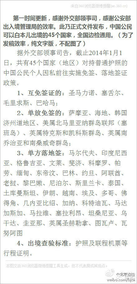 @北京边检 公布公安部自建国以来最大的变动-全面放开中国公民免签落地签出境!